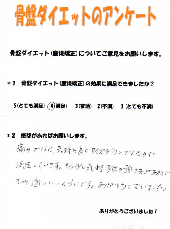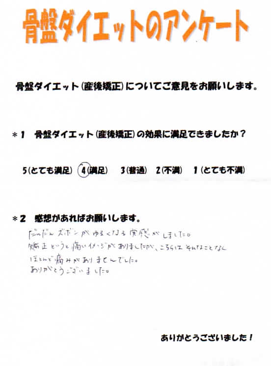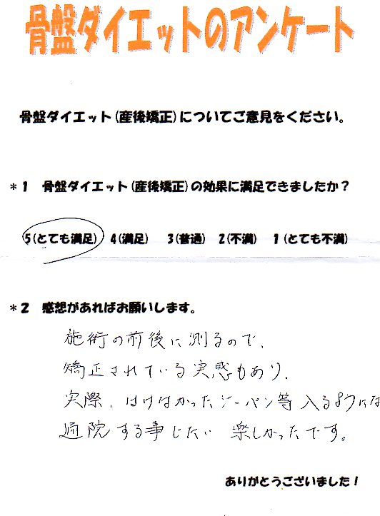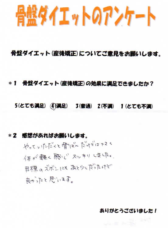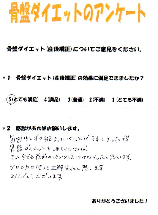 骨盤ダイエットをしていなければきっと今でも産前のパンツははけなかったと思います。プロの力を借りて正解だったと思います。