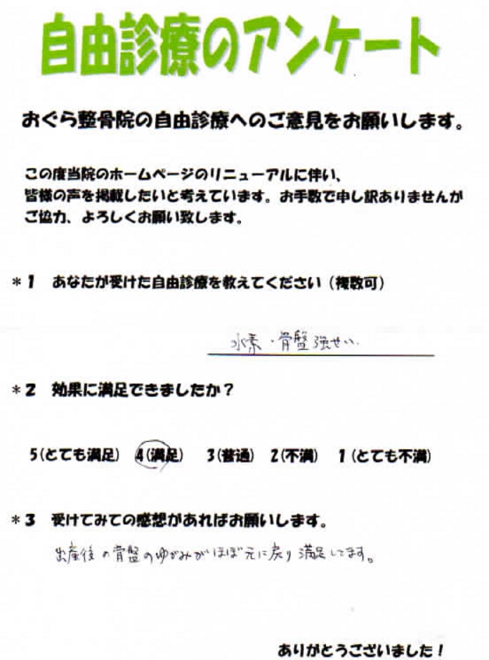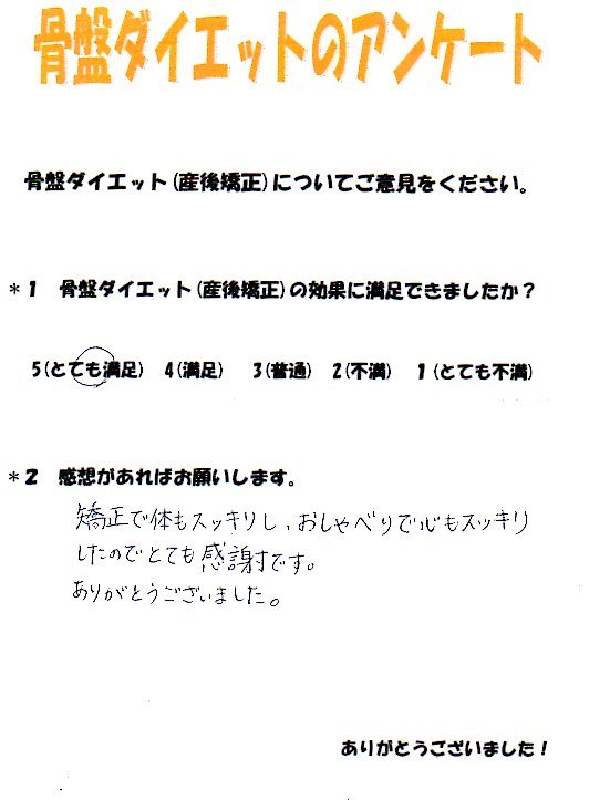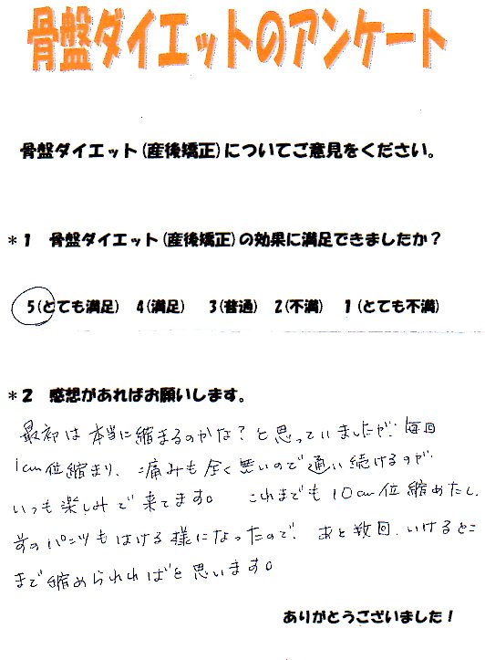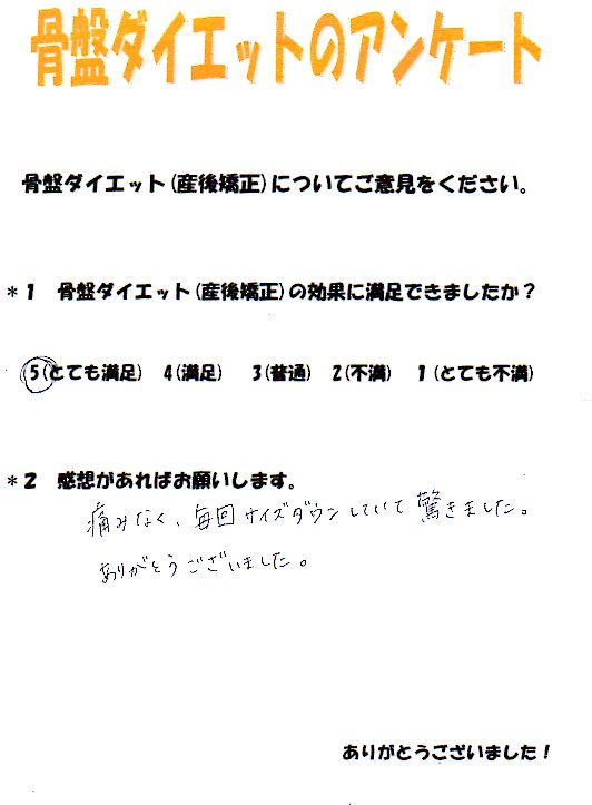 - 出産後の骨盤の歪みがほぼ元に戻り満足しています。